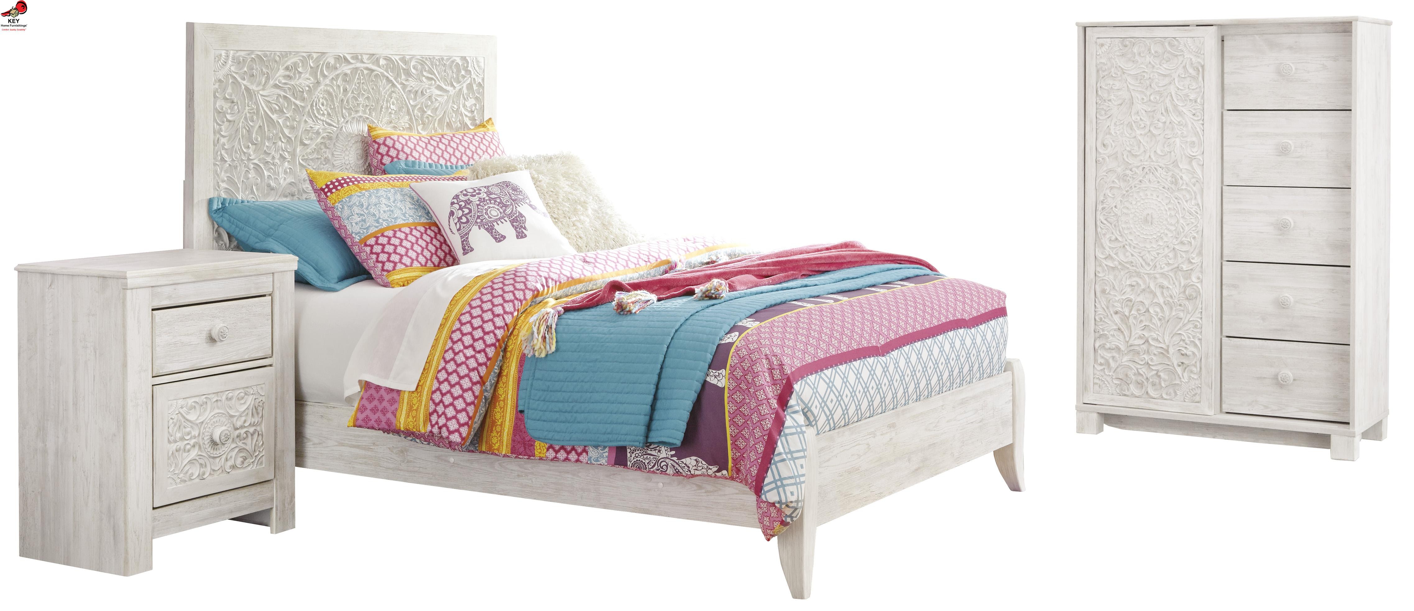 The paxberry full panel bed consists of bed, home furnishings, furniture, bed frame, furnishing for bedroom, bedroom furniture set. Ashley furniture is the largest united states home furnishings maker and retailer that manufacturers and distributes home furniture products throughout the world. Exquisite carved medallion pattern is a testament to true style. Inspired by bohemian tapestries, exquisite carved medallion pattern is a testament to features: Charming whitewashed finish sets a foundation for bedding bursting with color.